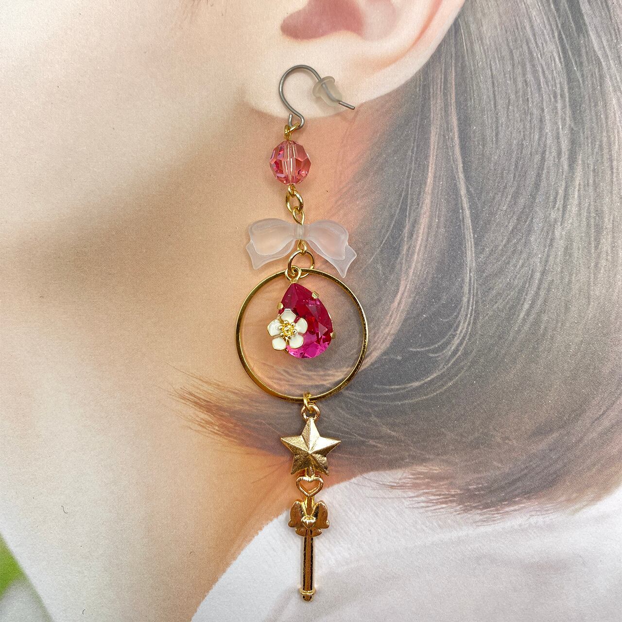 スワロフスキーとアクリルリボン、チャームのロングピアスです。