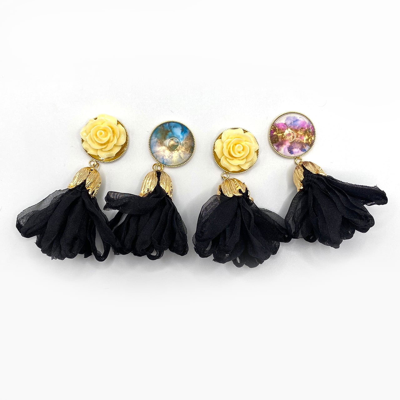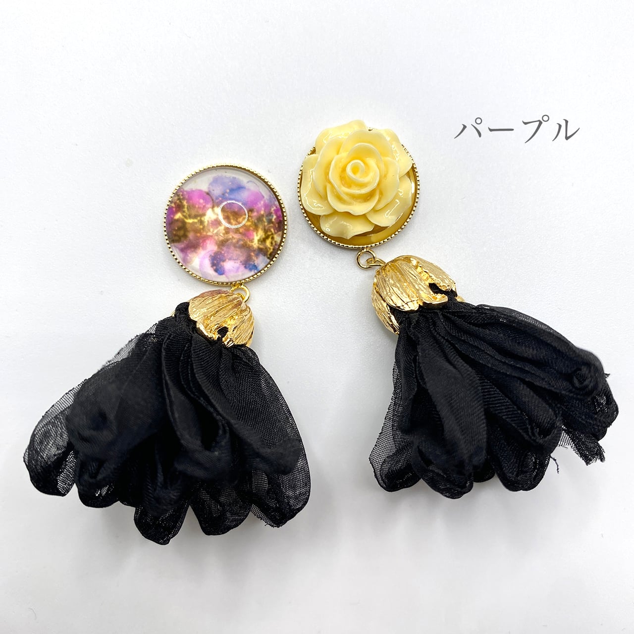 バラのカボションとガラス、シフォンリボンのイヤリング/ピアスです。