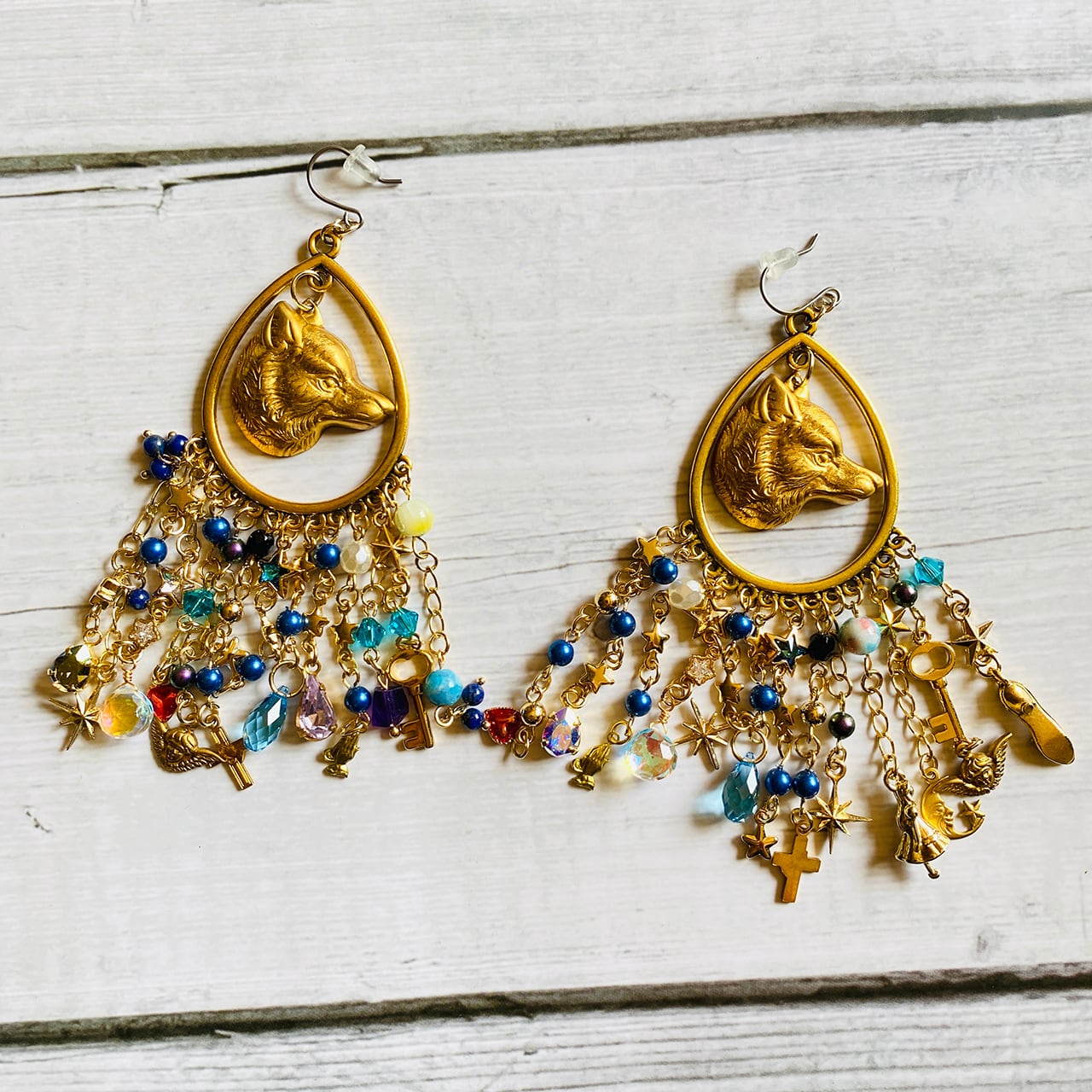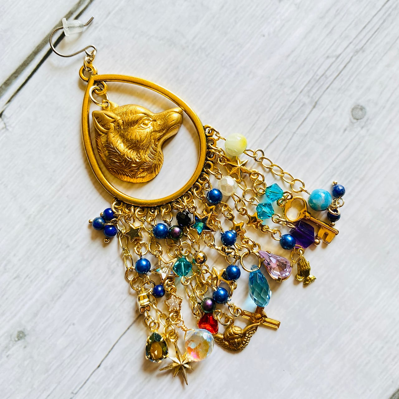 貴和クリスタル、天然石、狼の真鍮チャーム等を使用したピアスです。