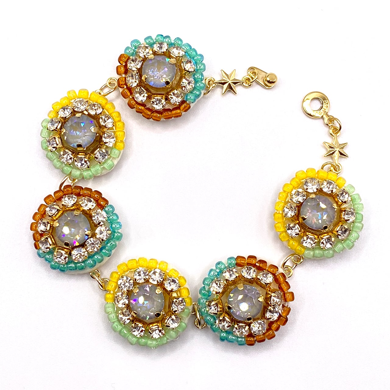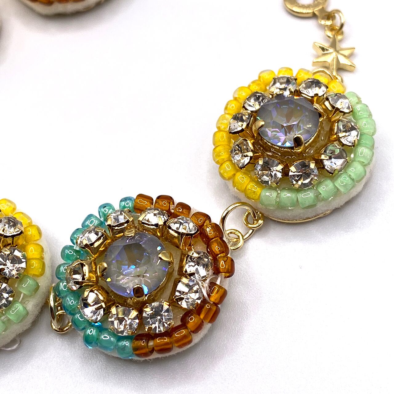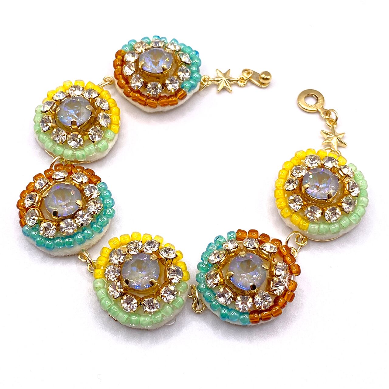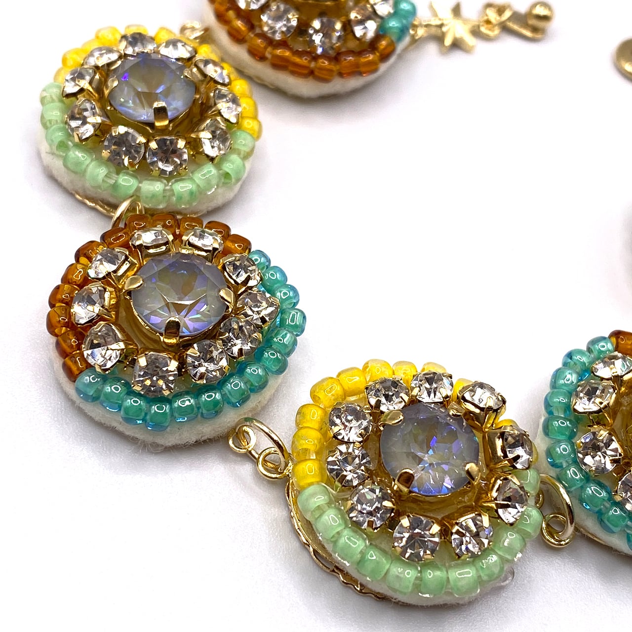 貴和クリスタルとビーズをフェルトに刺繍してから繋げたブレスレットです。