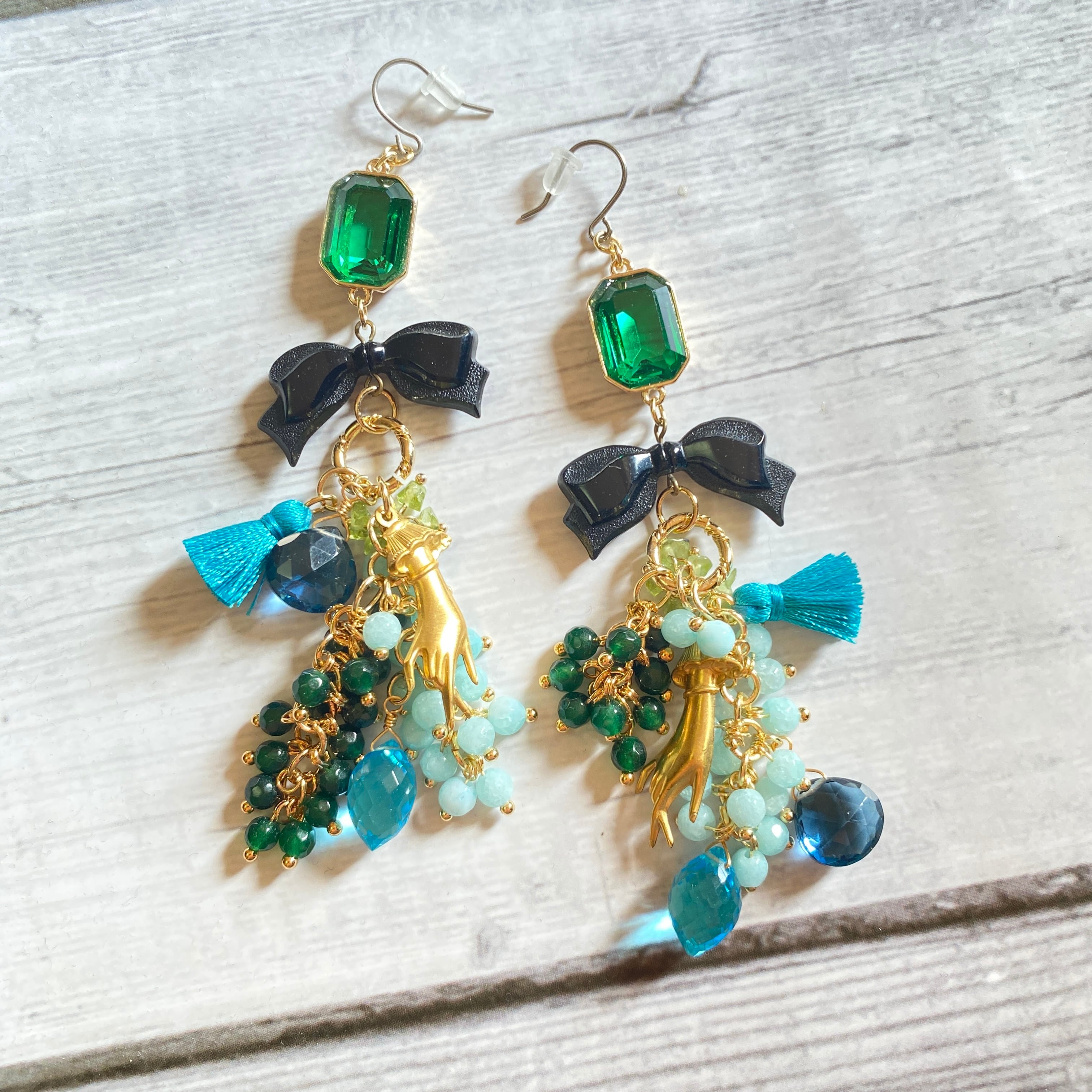 貴和クリスタルとタッセル、天然石などのピアス(イヤリング交換可能)です。