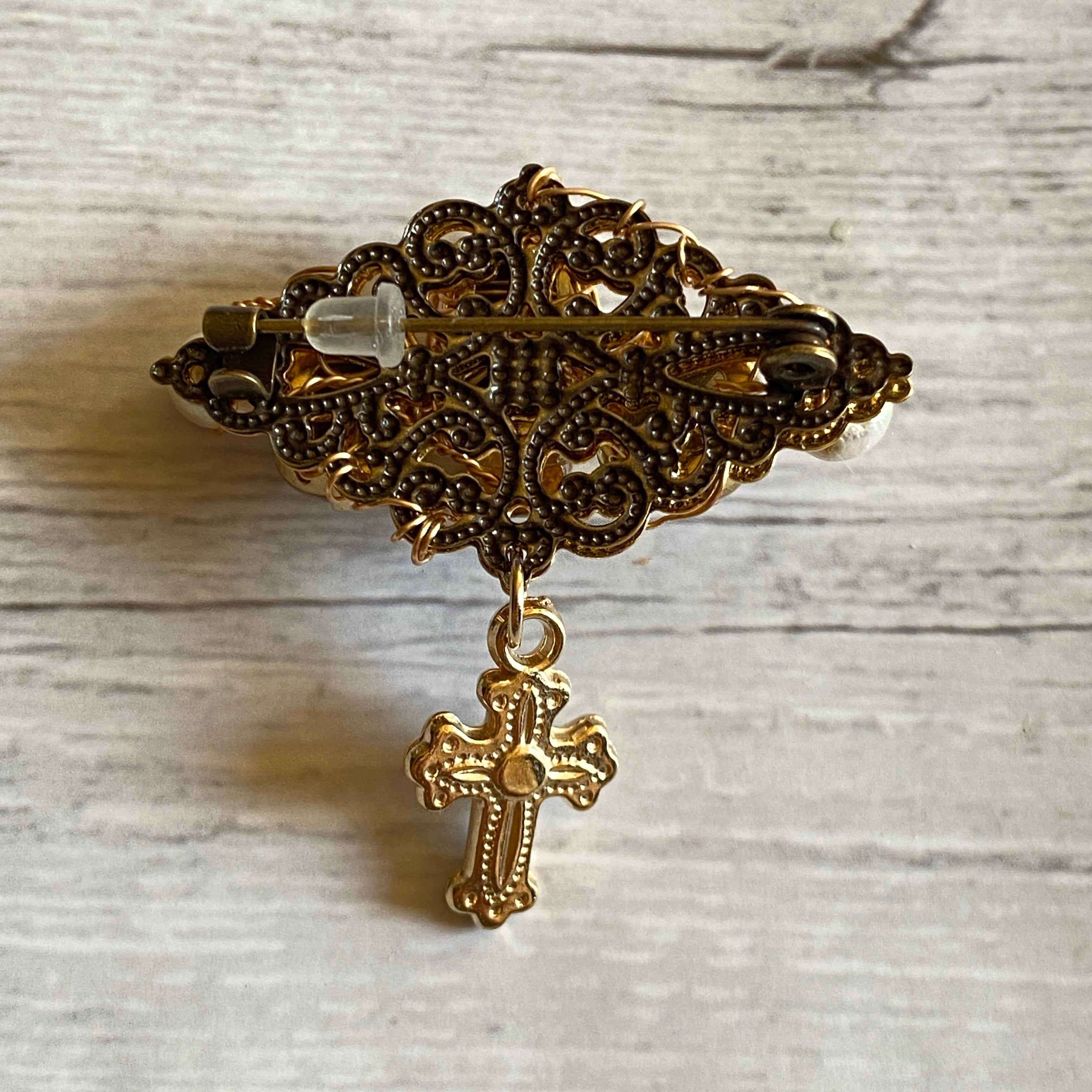 貴和クリスタルや真鍮パーツなどのブローチです。
