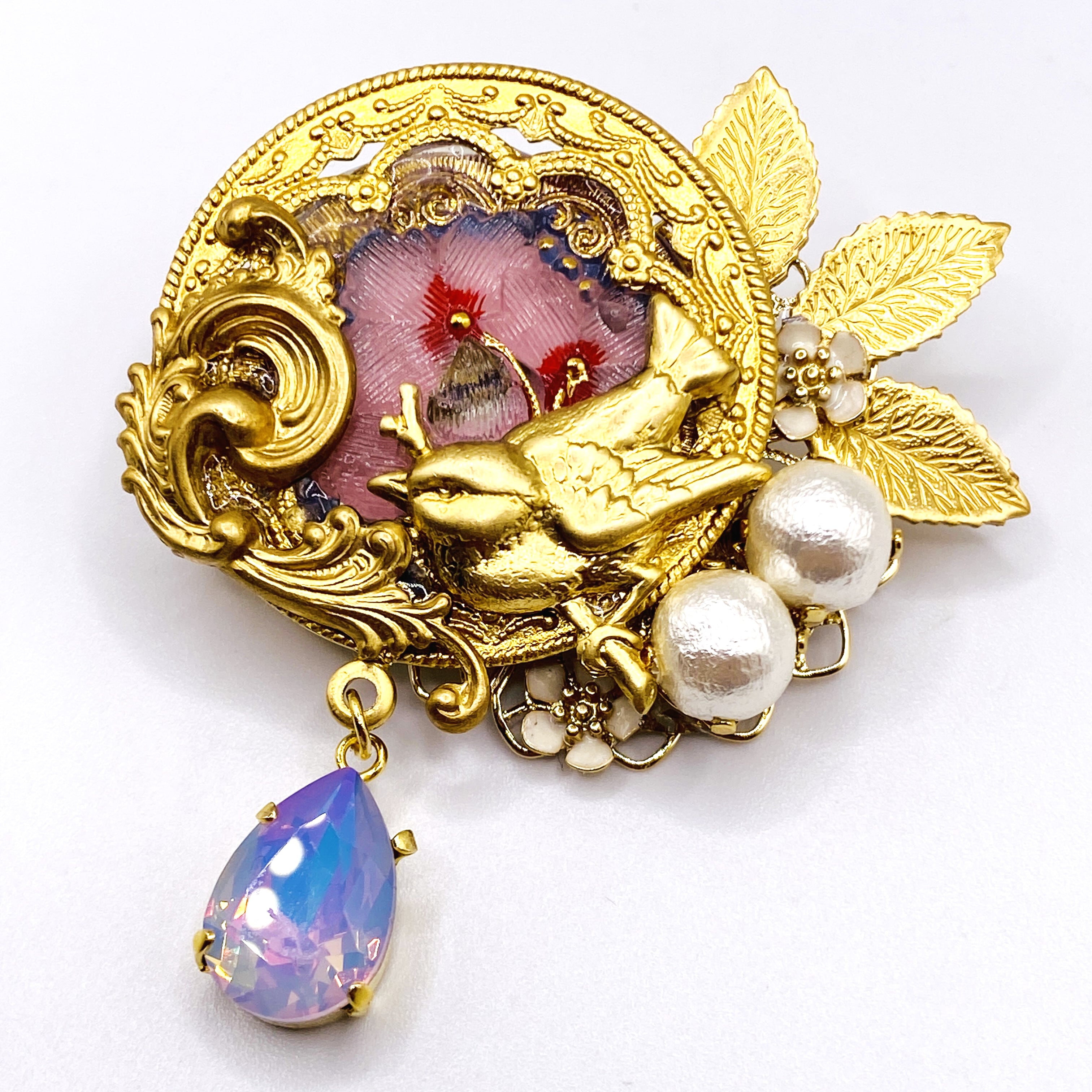 チェコガラスカボションと貴和クリスタル、真鍮パーツ、コットンパールなどのブローチです。