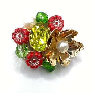 金色の花と真珠が、光で編まれた小さな冠。 貴和クリスタルとチェコビーズ、淡水パールなどのブローチです。 ⚠️尖った部分がありますので、お取り扱いにはご注意ください。 【ピンの付け方】 ① シリコンキャッチを、いったん針から外します。 ② ピンの針を、お洋服などに刺します。 ③ もう一度、針にシリコンキャッチを付けます。 ④ 最後に、針をストッパーにしっかり取り付けます。 こうしておくと、万が一ストッパーが外れてもシリコンキャッチが残るので、落下を防ぐことができます。 【サイズ】 直径:約3センチ ※写真で見るより小さいと思います。