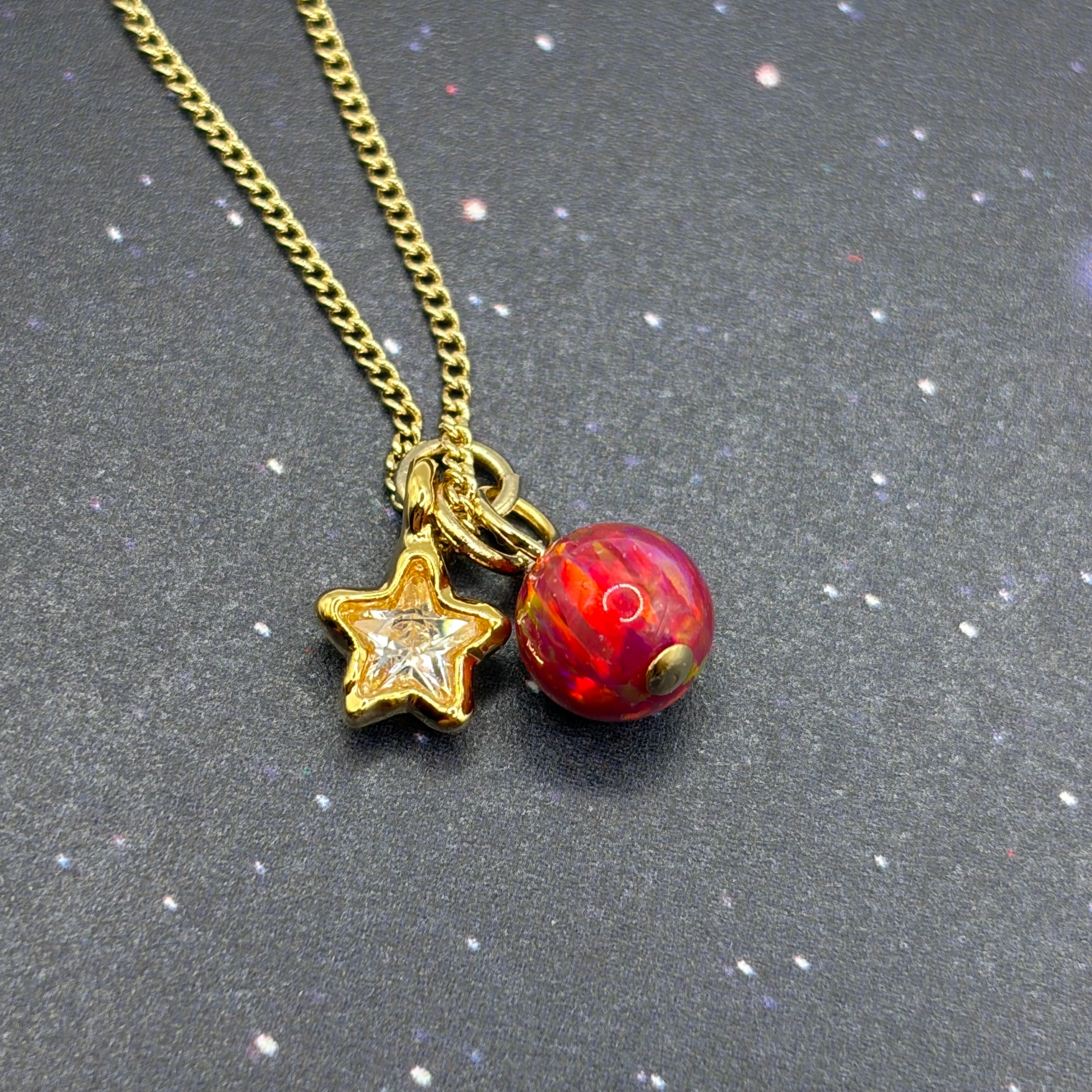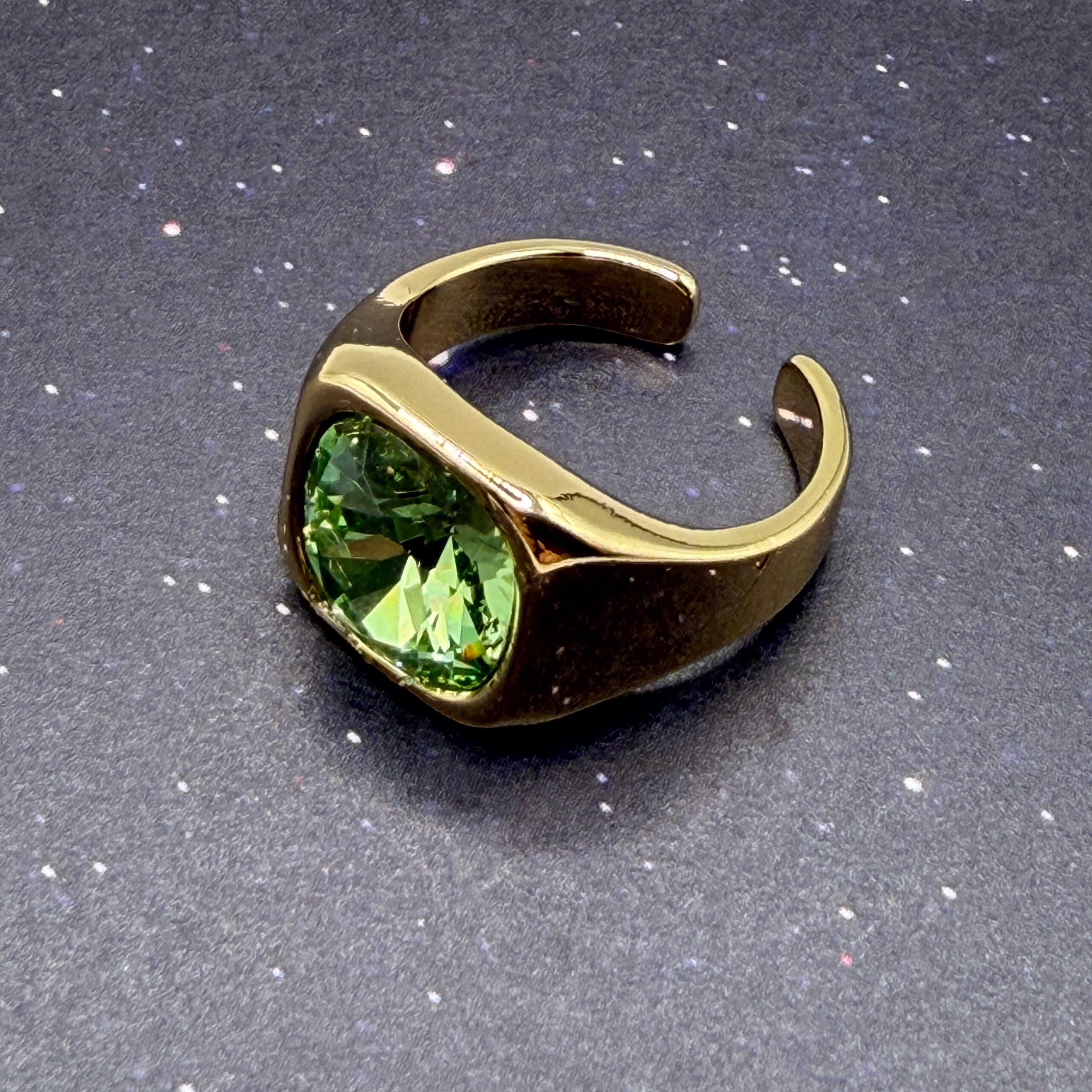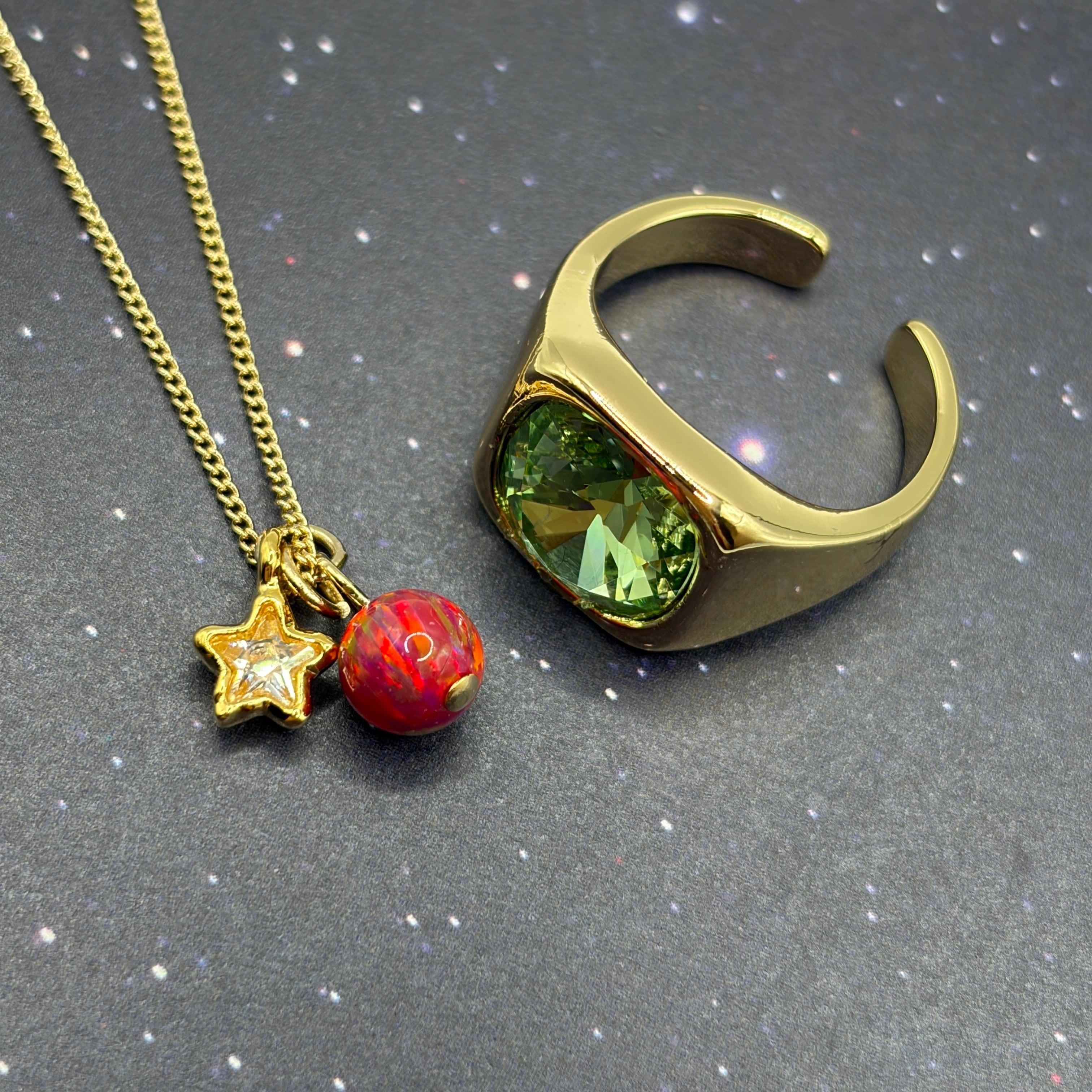 故郷を救うために宇宙でがんばるお話です。 貴和クリスタル(10mm)のシグネットリングと、京都オパール(6mm)のネックレスです。 リング台はニッケルフリーメッキです。通常のメッキと比べてアレルギーが出にくい仕様です。 【サイズ】 リング:12号 ネックレス長さ:約38センチ(+アジャスター)