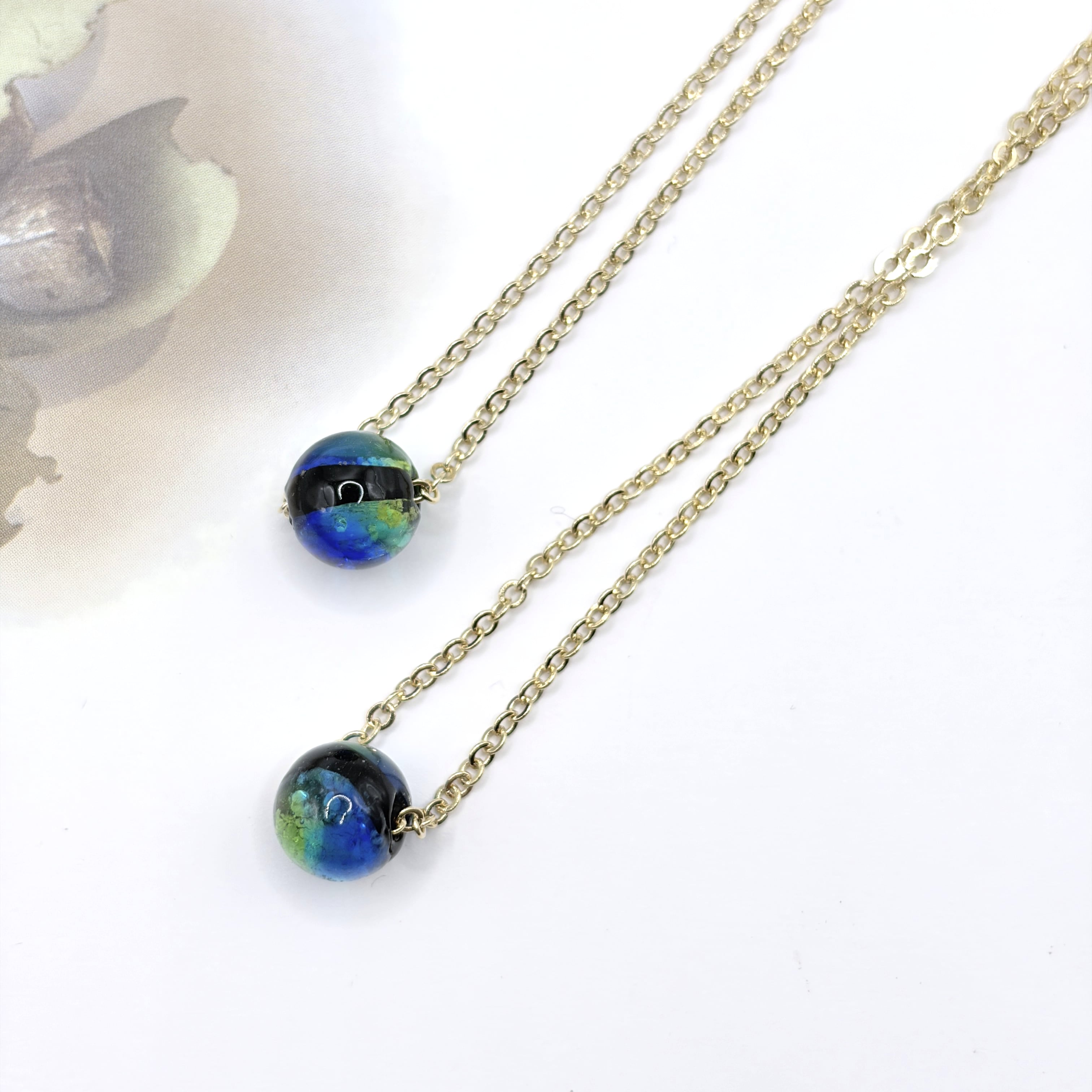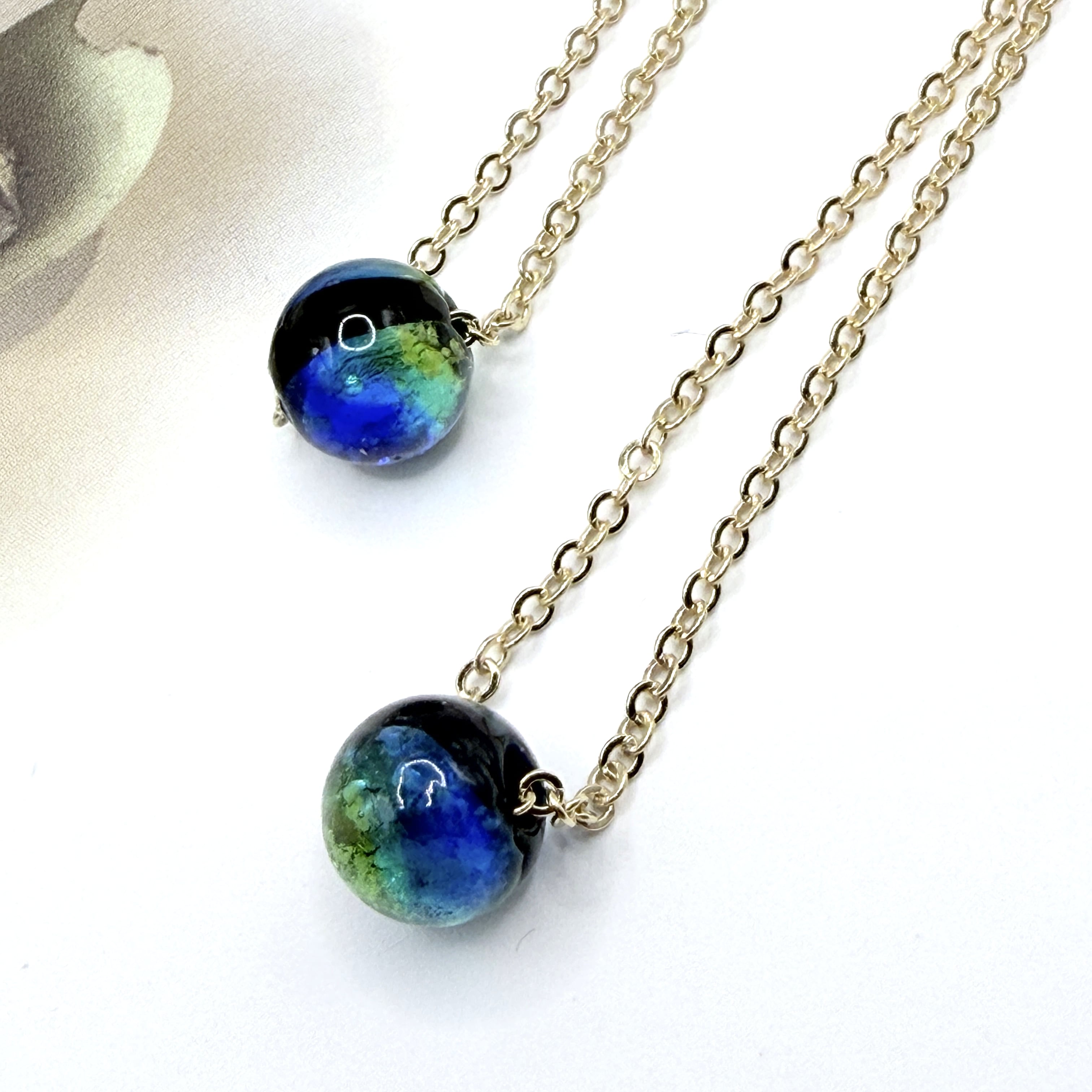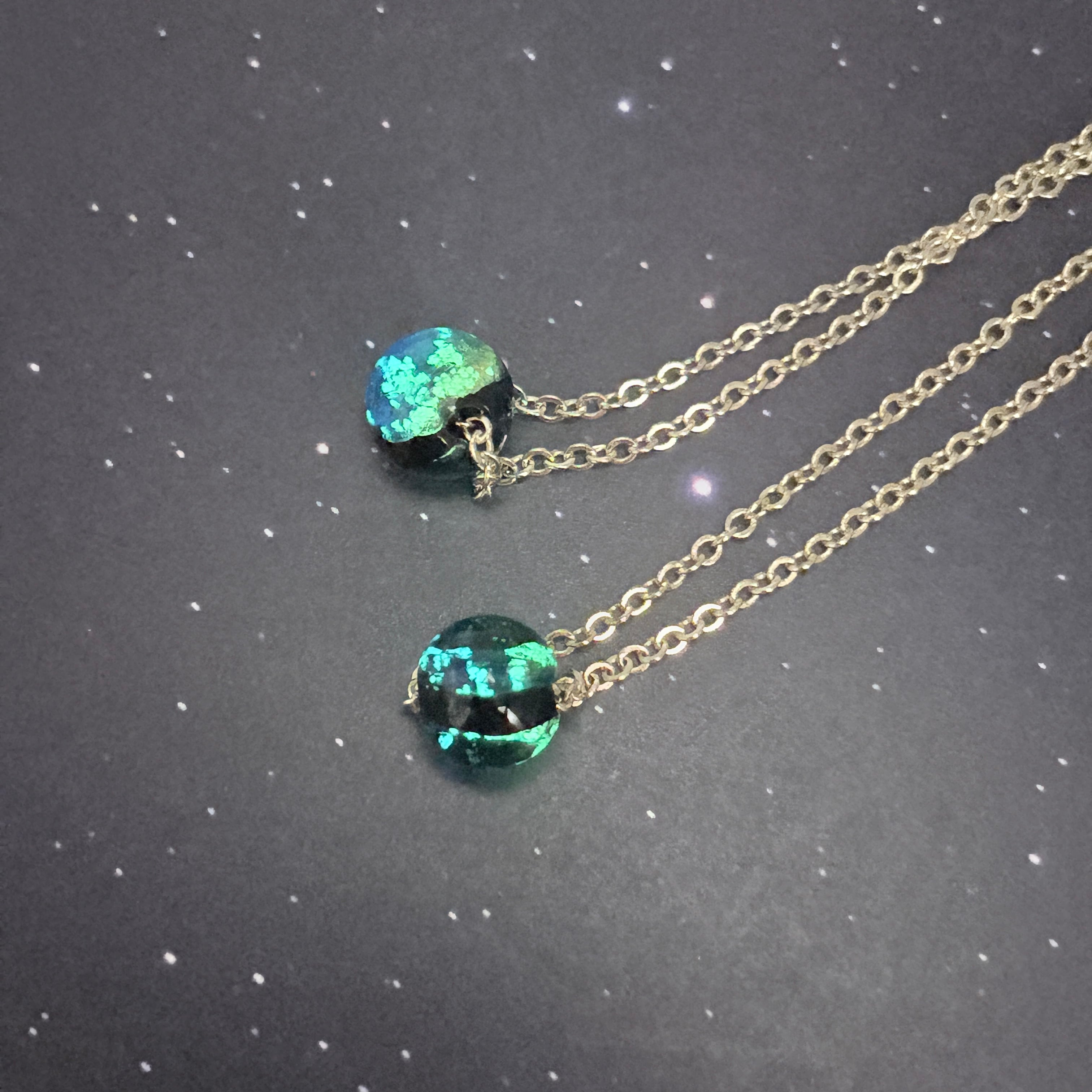 蓄光ホタルガラスのネックレスです。 ビーズは強い光を当てたあと、暗闇で光ります。 【サイズ】 長さ:約45センチ(+アジャスター)、約55センチ(+アジャスター)