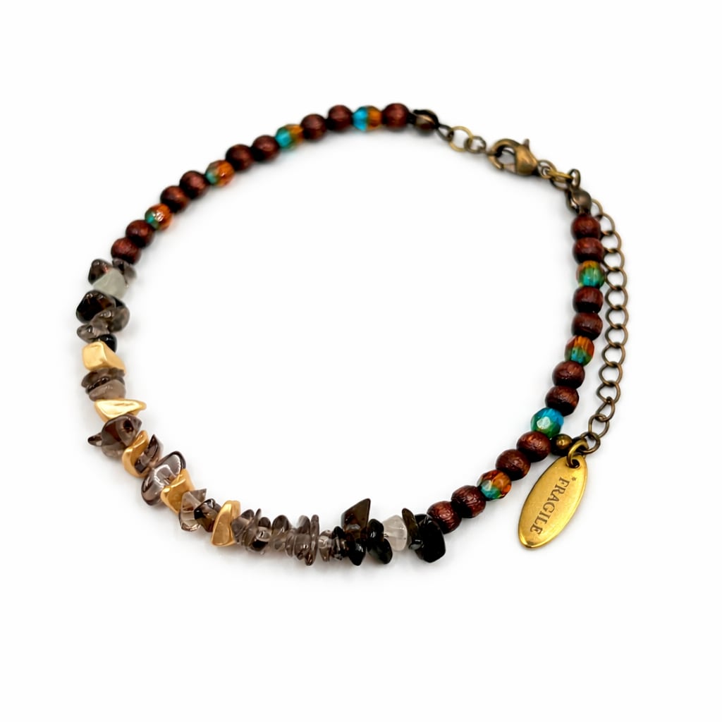 硬さの中に、かすかなぬくもりを重ねたブレスレットです。 遠い星の光と、異質なのに親しい存在をイメージしました。 ウッドビーズとチェコビーズ、スモーキークォーツ、メタルビーズを組み合わせています。 遠く離れた場所で出会った、岩のようなからだを持つ知的生命体。 無機質に見えるのに、ふしぎと温度を感じる。 硬さの奥にある静かなやさしさを閉じ込めました。 【サイズ】 長さ:約17センチ(アジャスターあり)