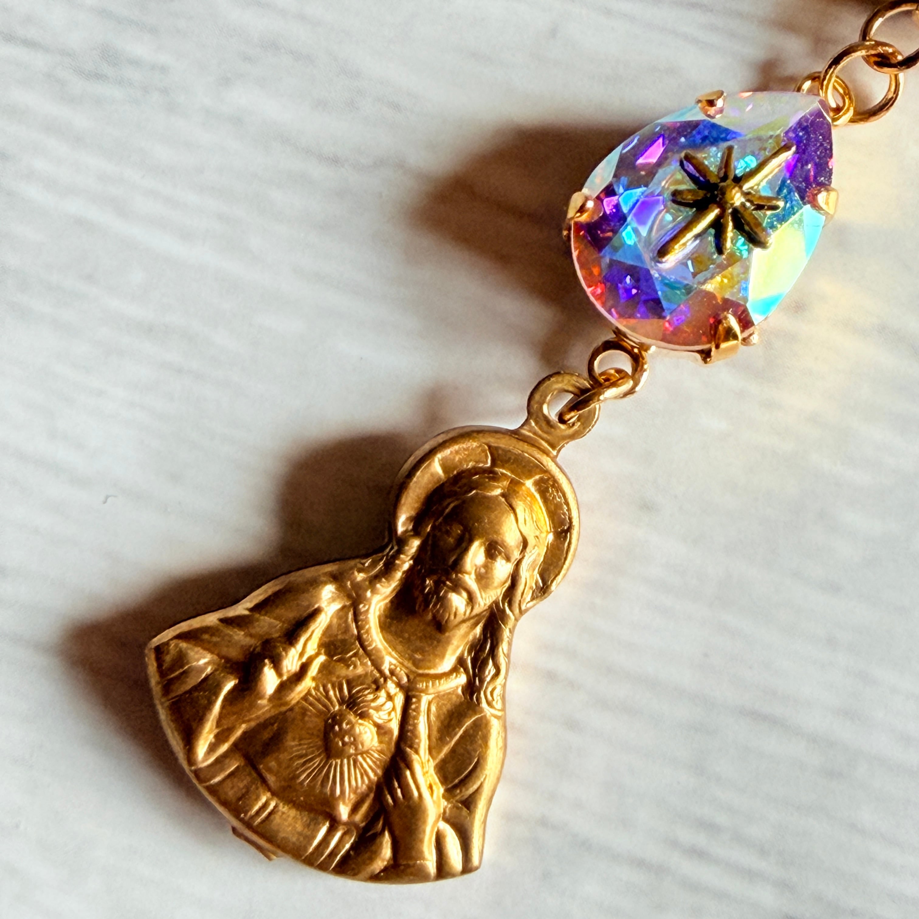 祈る手と、光を背負うキリストとマリアのチャームに、虹色に光る貴和クリスタルを添えたピアスです。 強い光と静けさが同時にあるような、少し張りつめた空気感を意識しました。 遠く隔たれた場所で、声をひそめるように続けられる祈り。 見えないものを信じることの重さと、それでも手放さない静かな意志を、 小さなかたちに落とし込んでいます。 華やかさの中に、わずかに影を残した仕上がりです。 【サイズ】 長さ:約7センチ