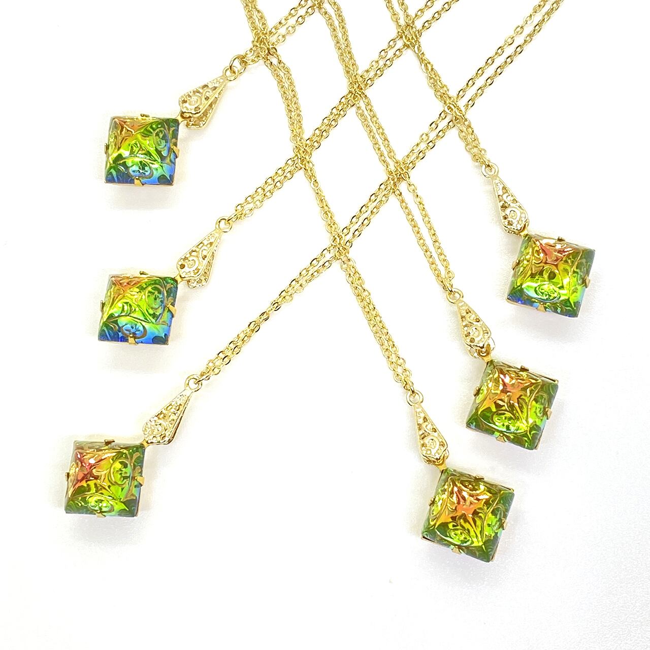 角度によって色が変わる、繊細なガラスカボションを贅沢に使ったネックレスです。輝く虹色が、あなたの胸元を彩ります。