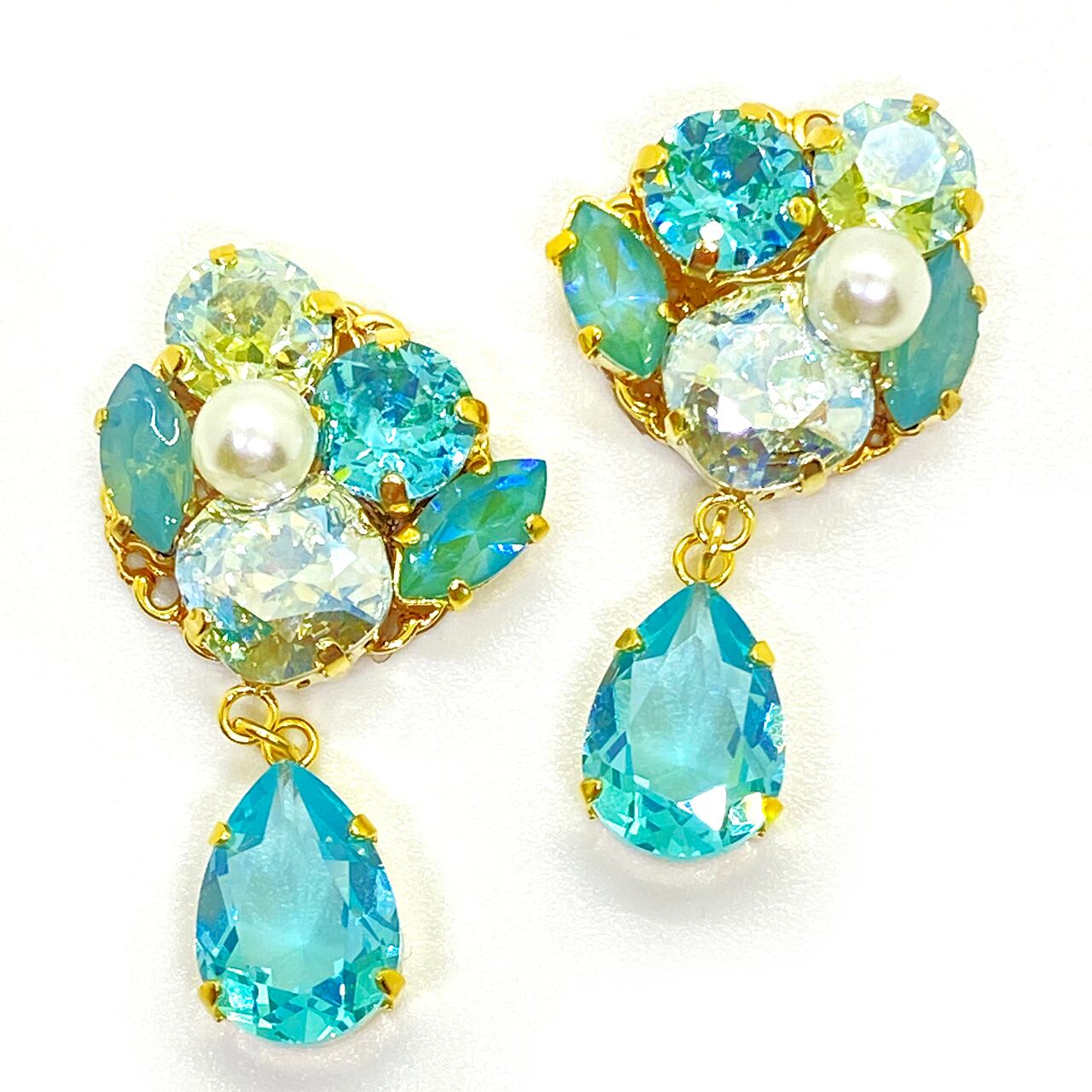 貴和クリスタル(クリスタルシルキーセージディライト、ライトターコイズ、クリソライトムーンライト、ライトアゾレムーンライト、廃盤のため色名不明)と樹脂パールのイヤリングです。