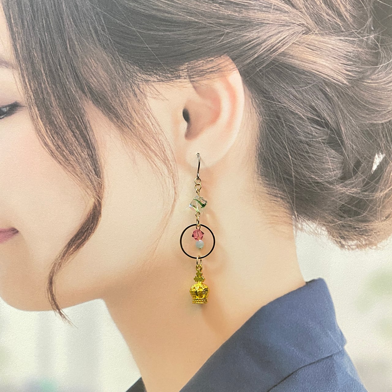 スワロフスキーとチェコビーズ、ラリマー、王冠チャームのピアスです。