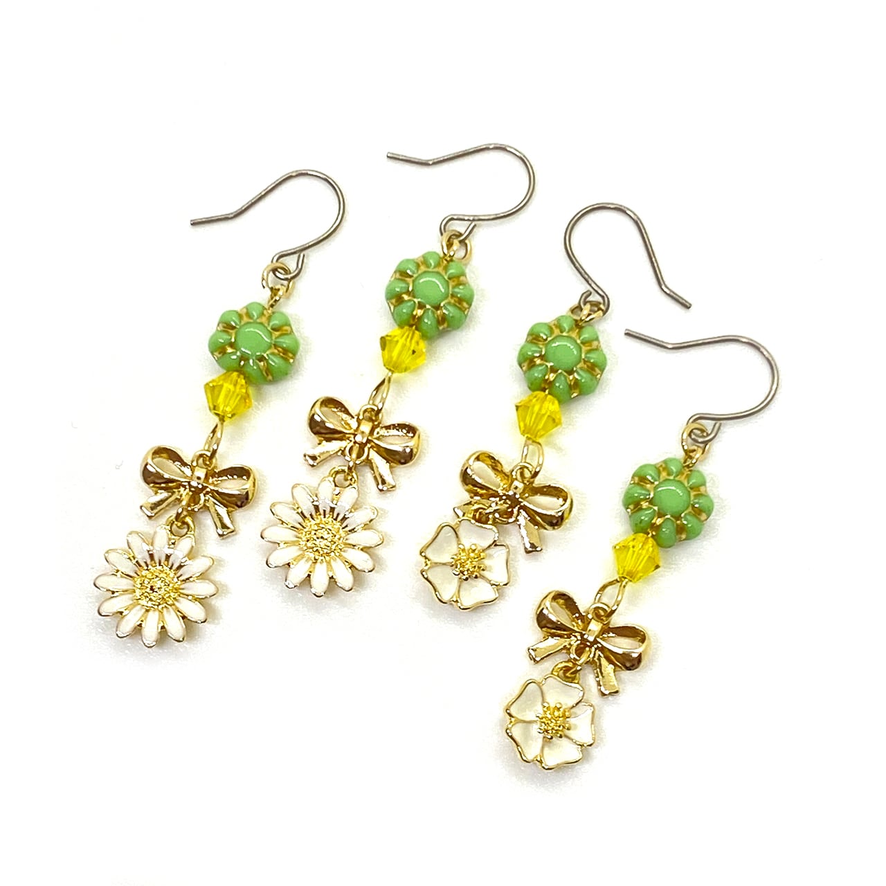 スワロフスキーとチェコビーズ、リボンチャーム、お花チャームのピアスです。