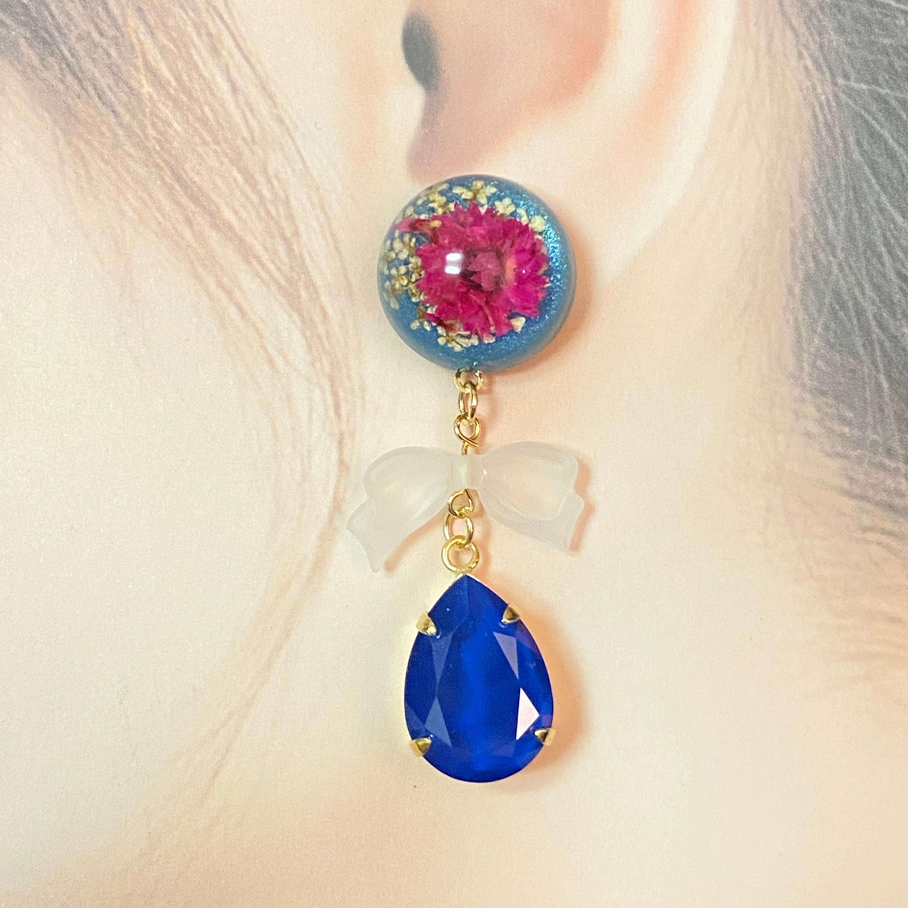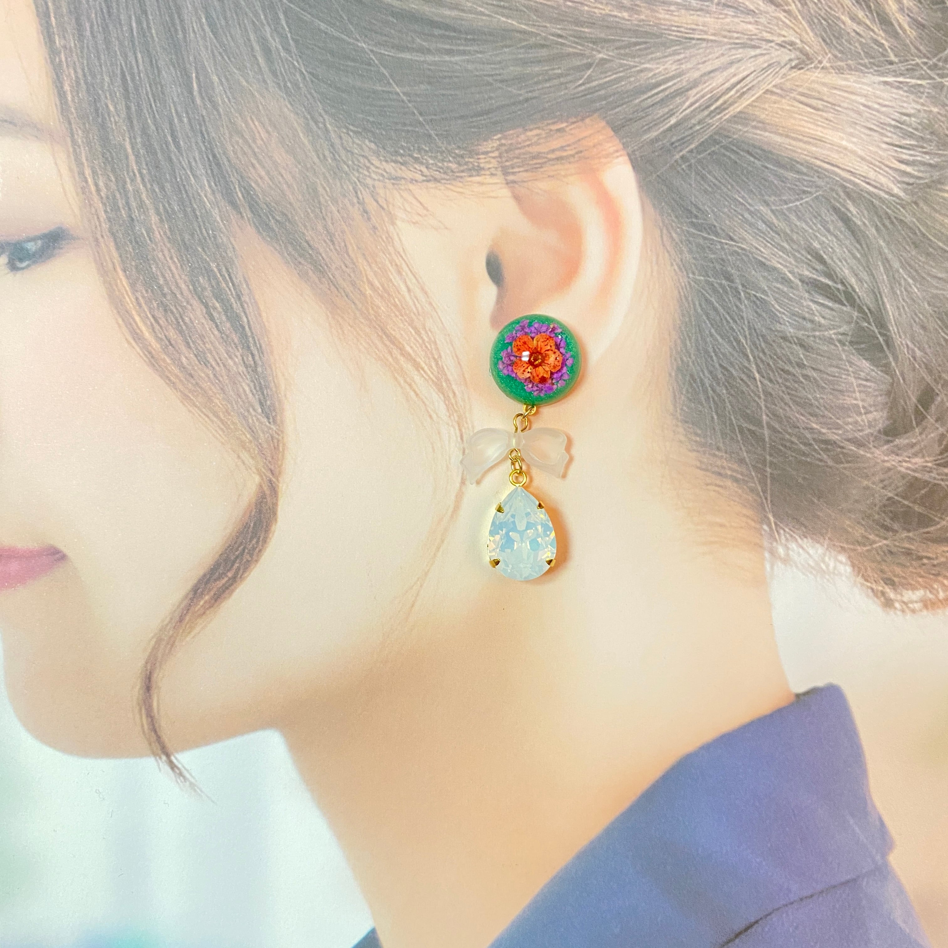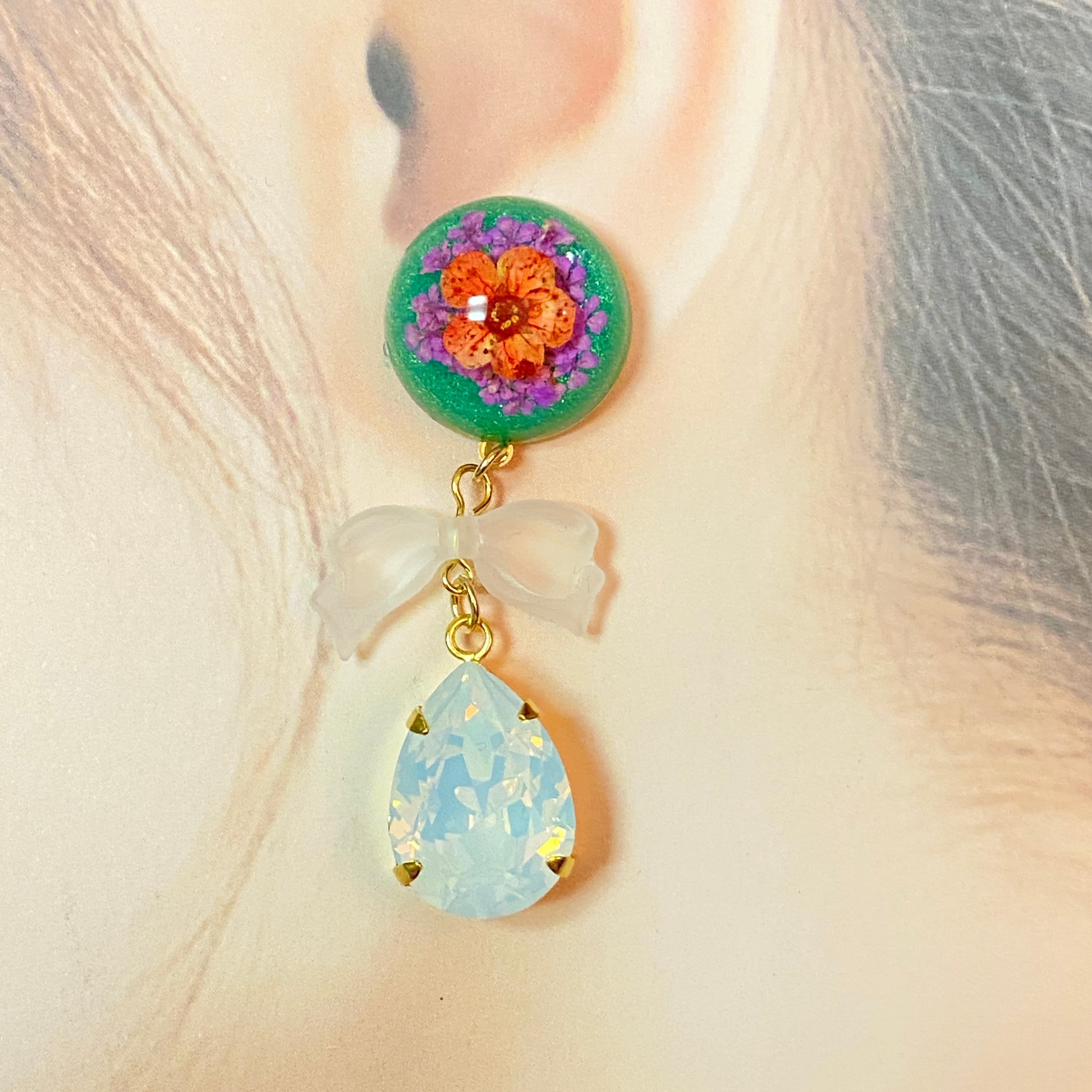 フランス製のカボションと大きめのスワロフスキーを合わせたピアス/イヤリングです。