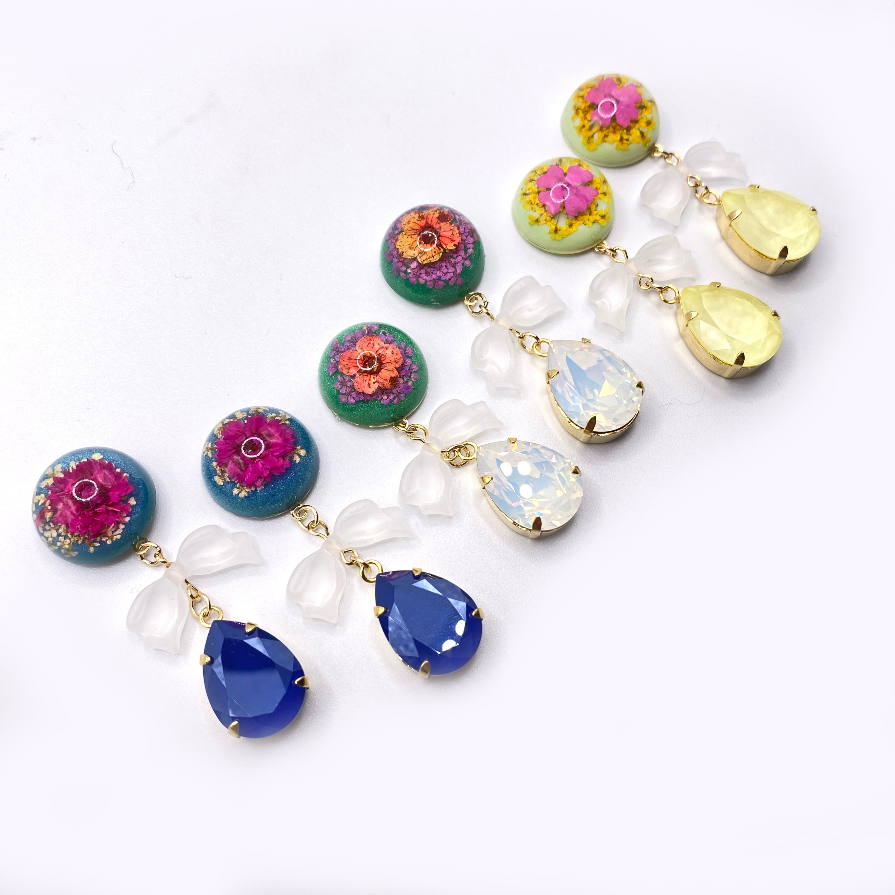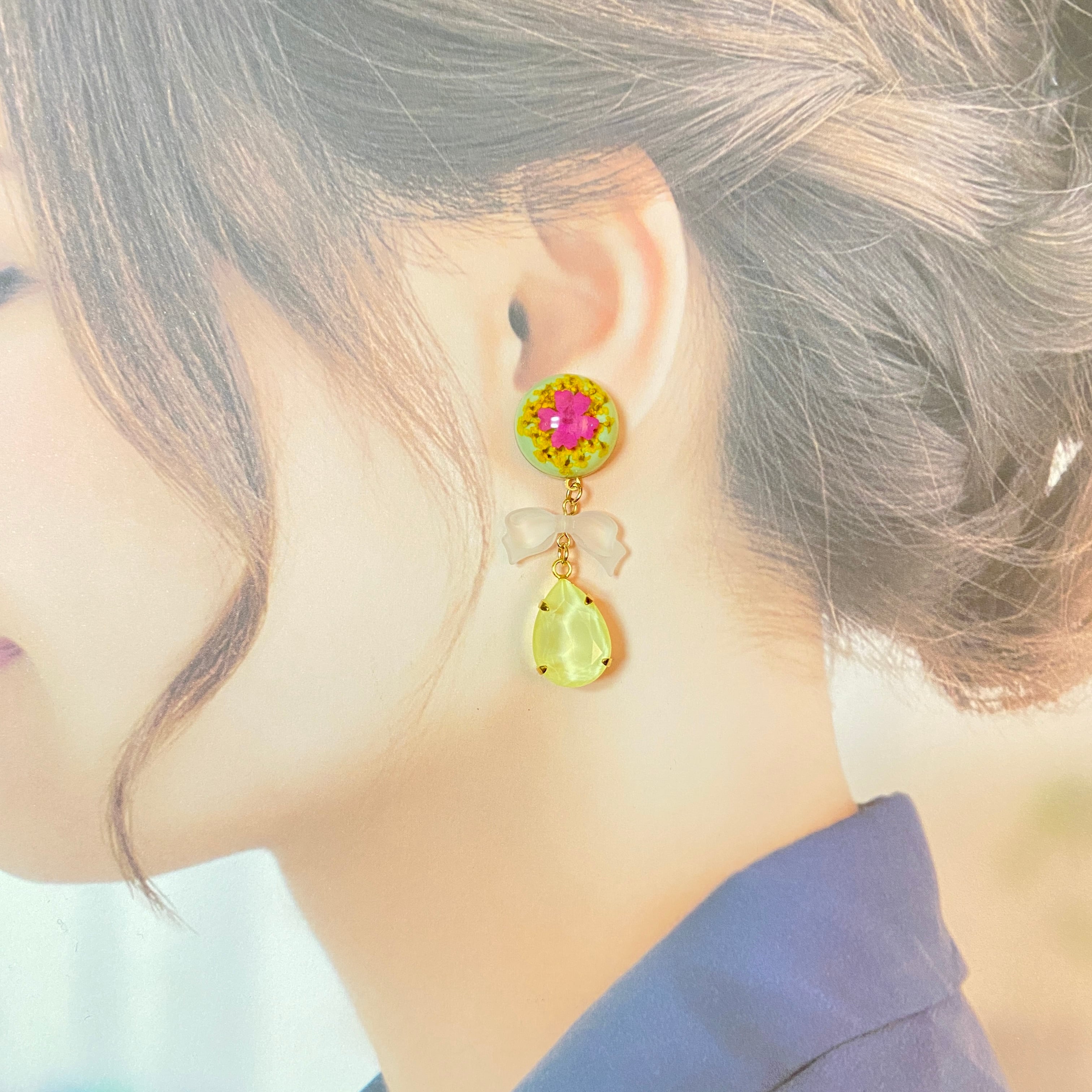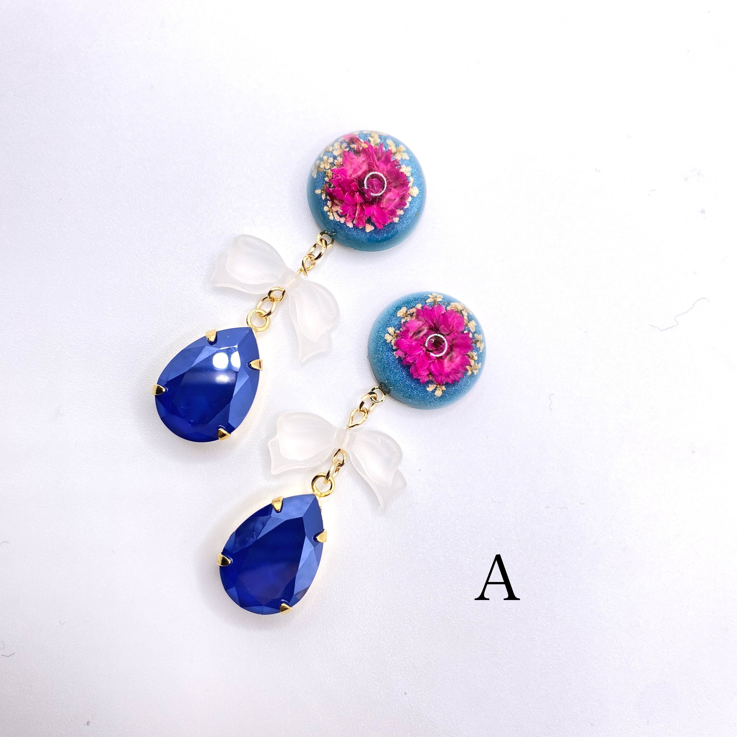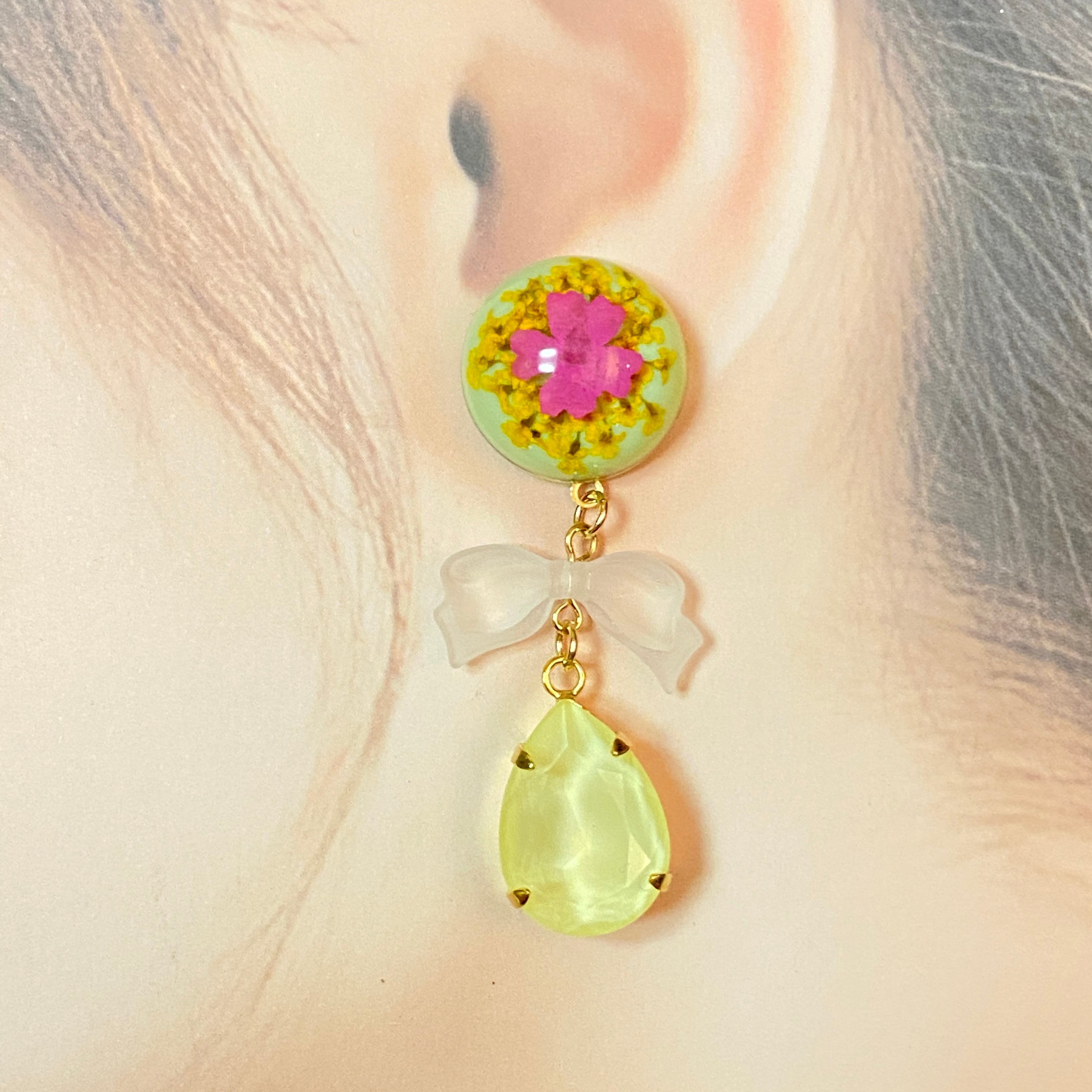 フランス製のカボションと大きめのスワロフスキーを合わせたピアス/イヤリングです。