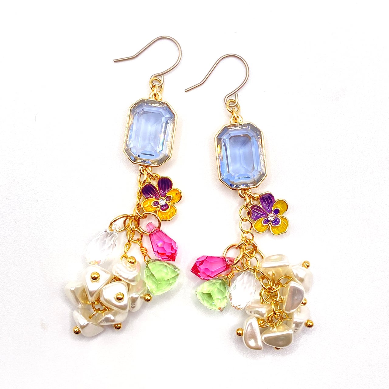 スワロフスキーと樹脂パール、マスカットグリーンカラークォーツ、パンジーのチャームのピアス(イヤリング交換可能)です。
