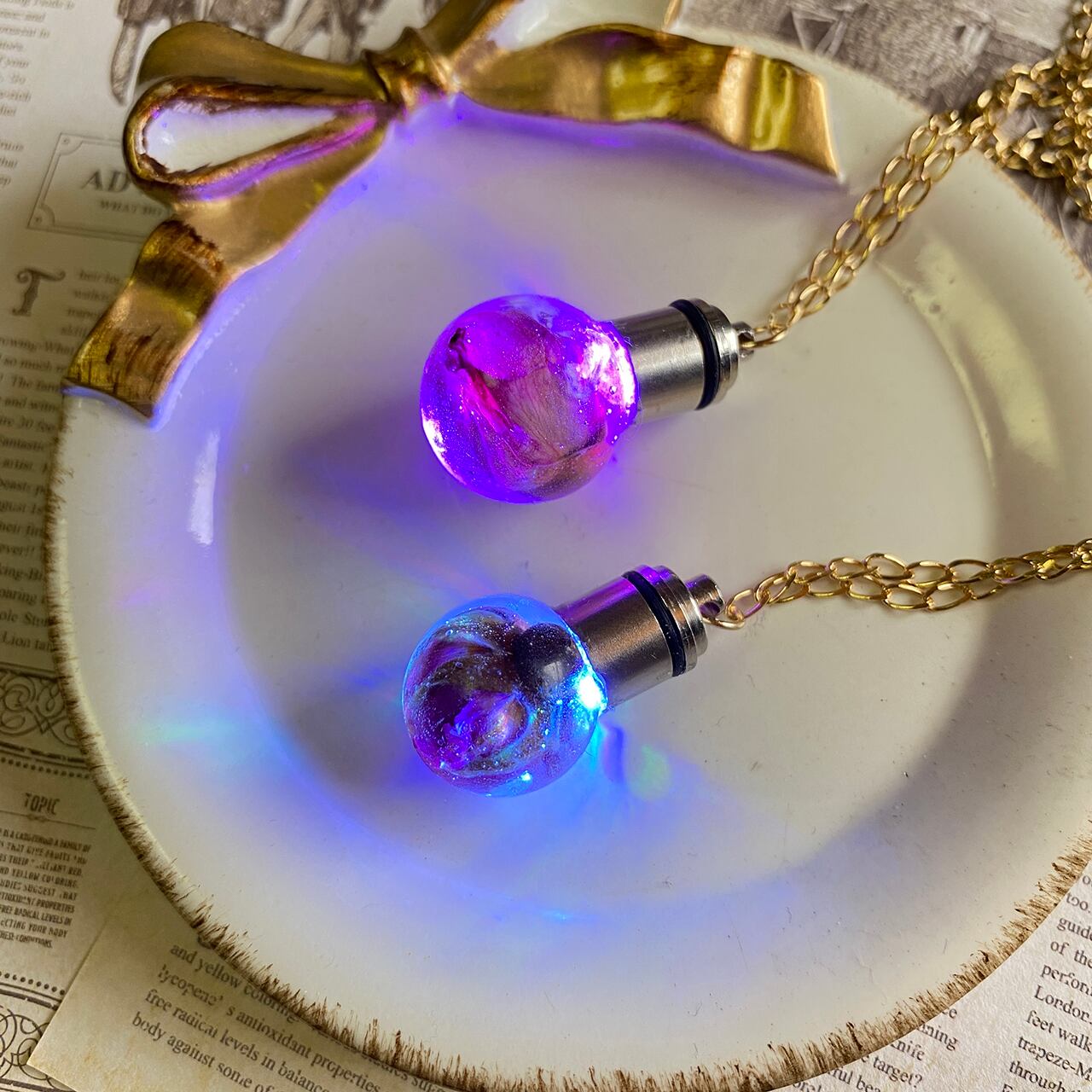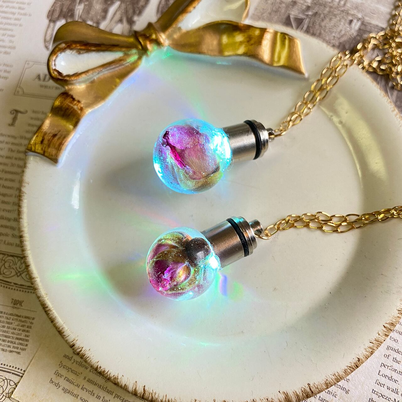 LEDライトが内蔵された、本物のバラのつぼみ入りレジン製ネックレスです。