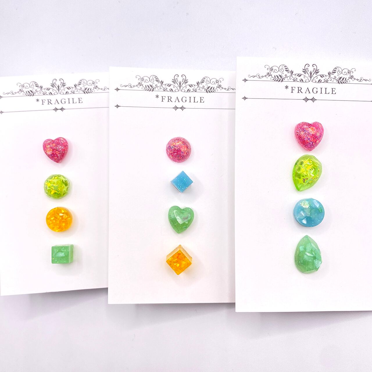 フロリダの安モーテルで暮らすシングルマザーと6歳の少女のお話です。 レジンの小さなスタッドピアス4点セットです。 イヤリングへの交換はできません。 【サイズ】 約6ミリ〜10ミリ